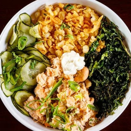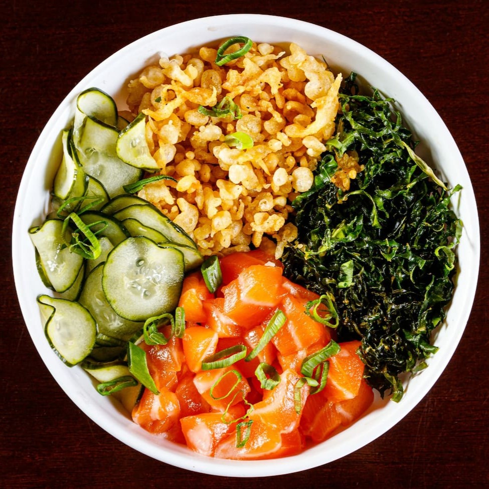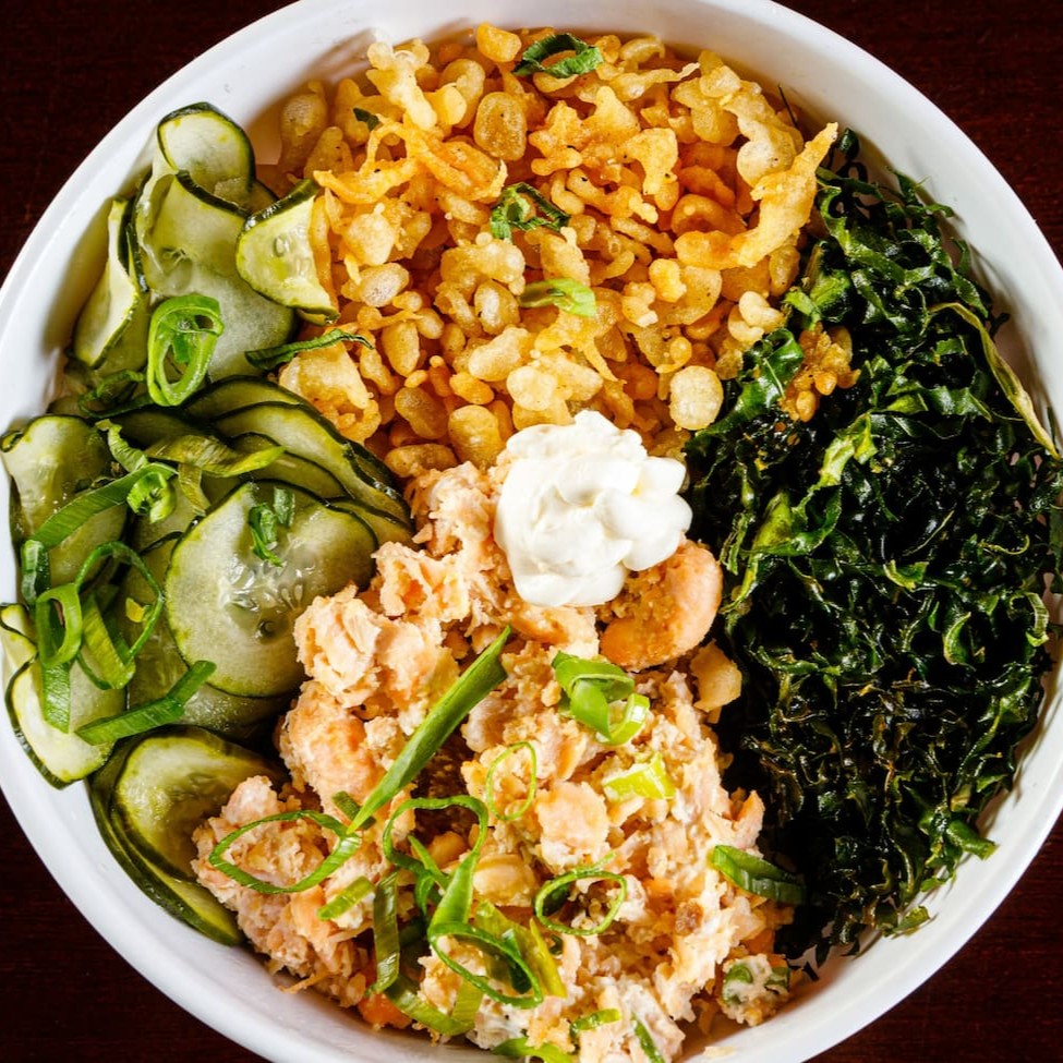 Base de arroz, couve crispy, massa crispy sunomono e salmão grelhado cream cheese e cebolinha, salpicados com gergelim torrado. A melhor experiencia de poke que você terá. Aproveite