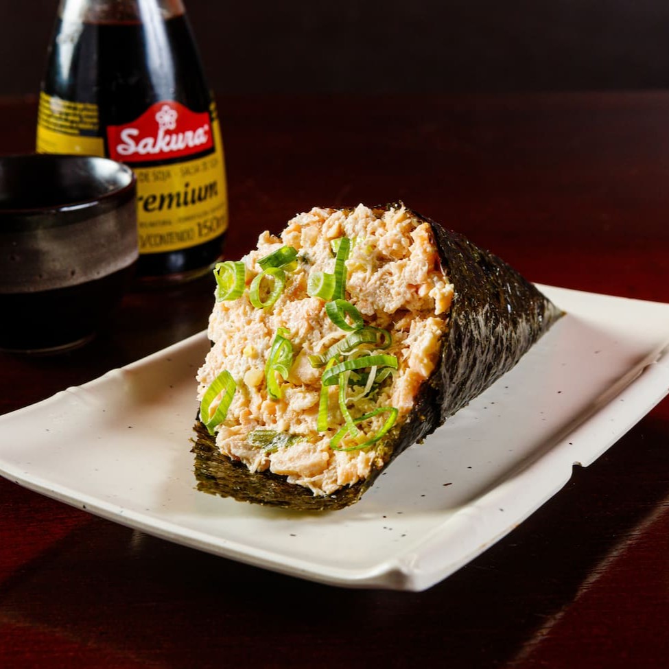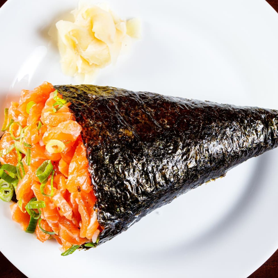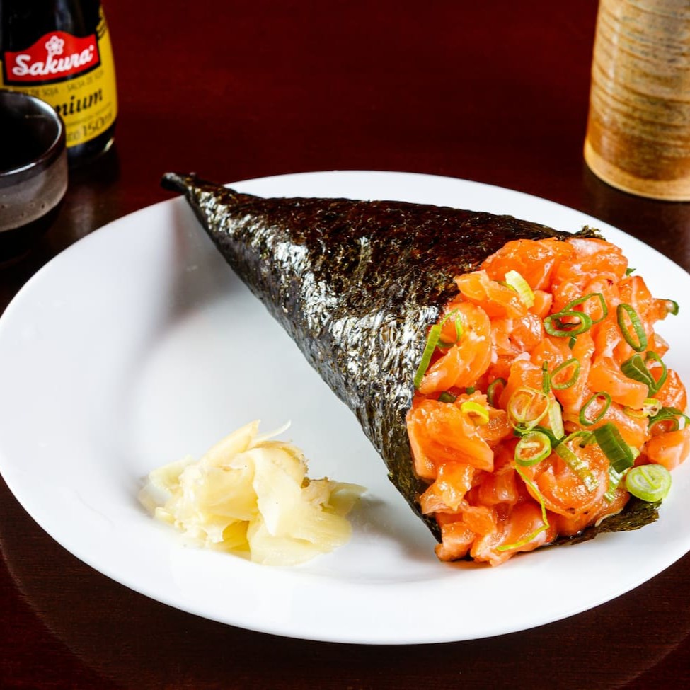 Temaki feito com a alga inteira, vai o dobro do recheio. Salmão, kani, skin e califórnia.