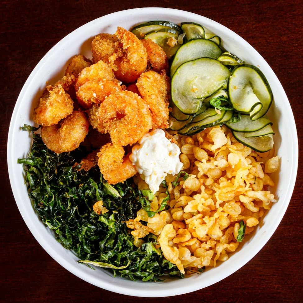 Base de arroz, couve crispy, massa crispy sunomono e camarão crispy e cebolinha, salpicados com gergelim torrado. A melhor experiencia de poke que você terá. Aproveite