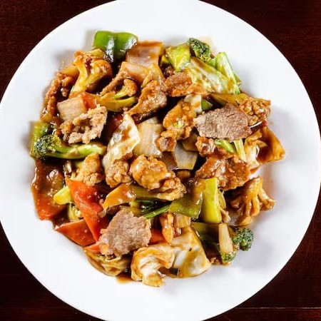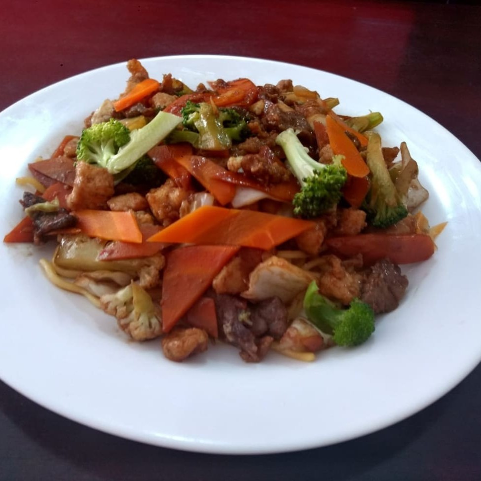 Macarrão chinês com pedaços de carne bovina, peito de frango, legumes selecionados temperados ao molho de soja.