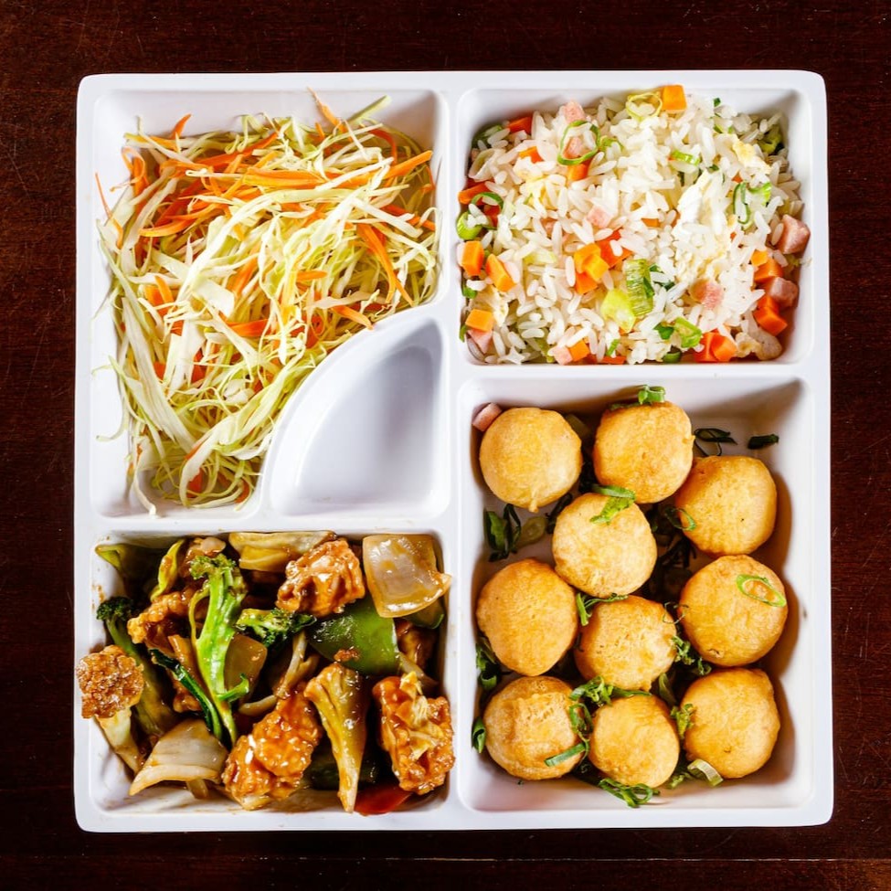 Frango xadrez+ yakimeshi+frango empanado+ salada+ Coca-Cola 350ml