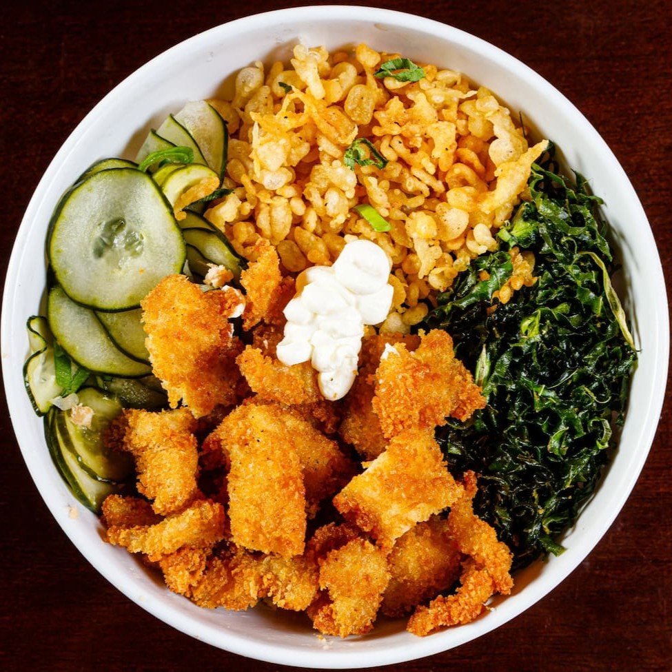 Base de arroz, couve crispy, massa crispy sunomono e frango crispy, cebolinha, salpicados com gergelim torrado. A melhor experiencia de poke que você terá. Aproveite