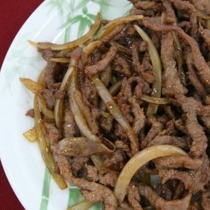 Pedaços de carne bovina com fatias de cebola ao molho de soja.