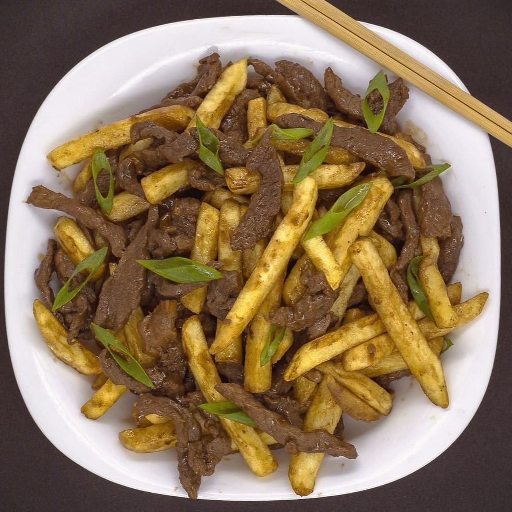 Pedaços de carne bovina com batata frita e cebolinha ao molho de soja.