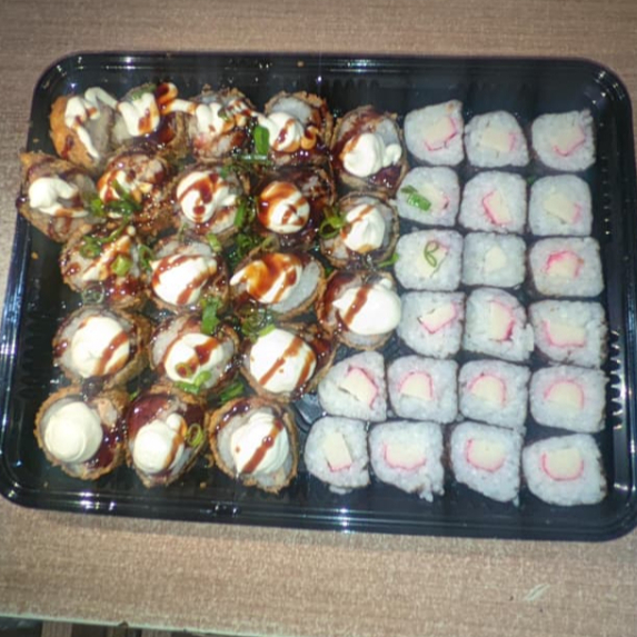 5 neguiri de salmão, 5 uramaki de salmão, 5 urakami grelhado com batata, 5 shakemaki de salmão, 5 kanimaki, 5 hot holls. não fazemos alterações !!!
