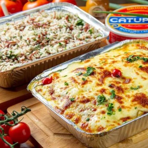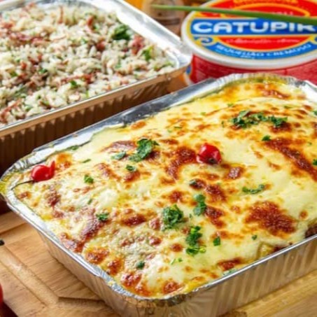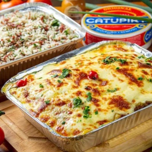 Gratinado com parmesão, preparado a base de pure de batata, com carne moida , Catupiry e mussarela , acompanhado de arroz branco