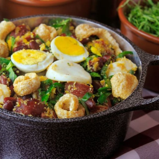 Delicioso feijão tropeiro com muito bacon , calabresa, torresminho,couve e ovo cozido. Apresentamos a nossa exclusiva versão do Feijão Tropeiro Mineiro , uma delícia já conhecida, agora reinventada. Preparado na autêntica manteiga de garrafa, que dá um sabor único e inigualável. É composto por feijão fradinho de alta qualidade, bacon, calabresa, farinha de mandioca, couve fresca, cebolinha crocante e para finalizar, adicionamos torresminhos e ovo cozido, tornando este prato um verdadeiro deleite.
