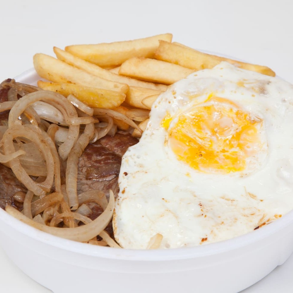 Saboroso bife de alcatra grelhado com cebola acompanhado:arroz e feijão fresquinho,fritas e