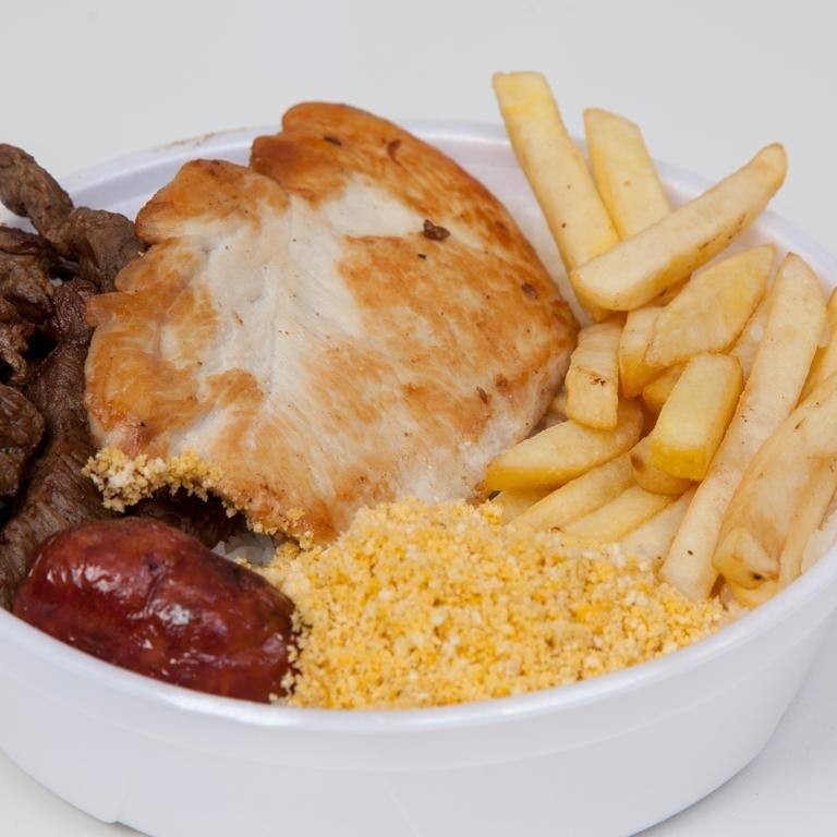 Saboroso prato com 3 misturas churrasco,1 Filézinho de frango Grelhado, 1 linguicinha frita, arroz e feijão fresquinho,fritas e farofinha de bacon