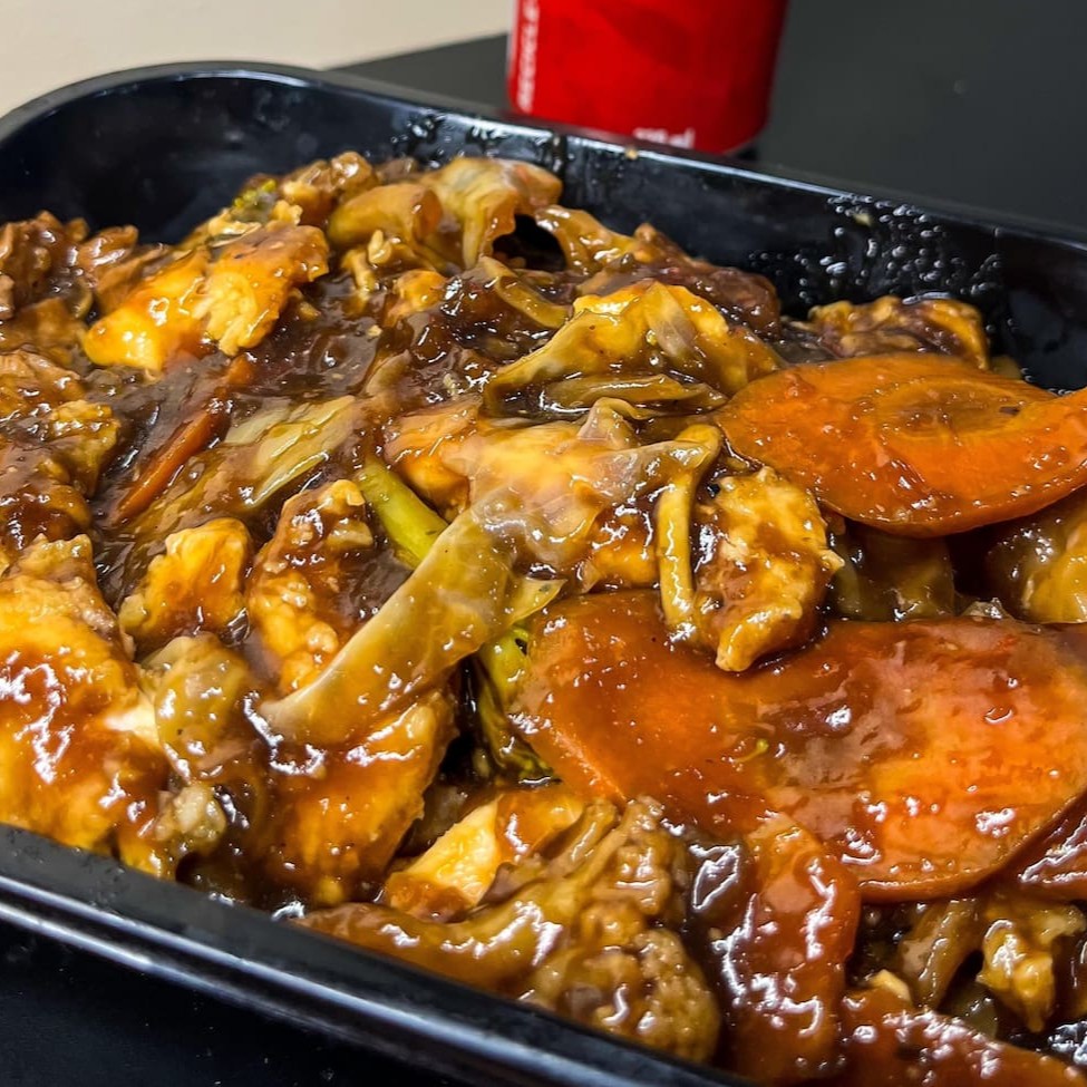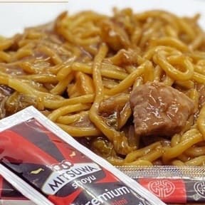 Delicioso yakisoba tradicional do mestre com carne em fatias ,frango em cubos legumes e macarrão ao molho do Mestre .
