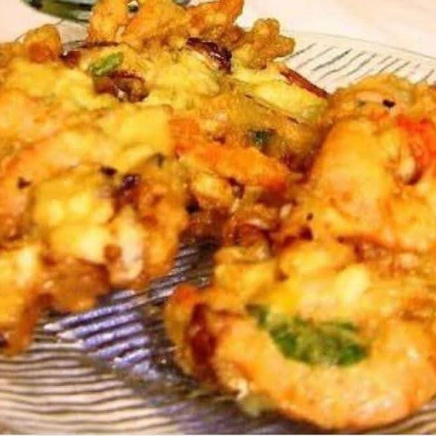 Delicioso tempurá de frango repolho ,batata ,cenoura ,brócolis ,cebola desfiados envolvidos em massa leve frito e crocante .