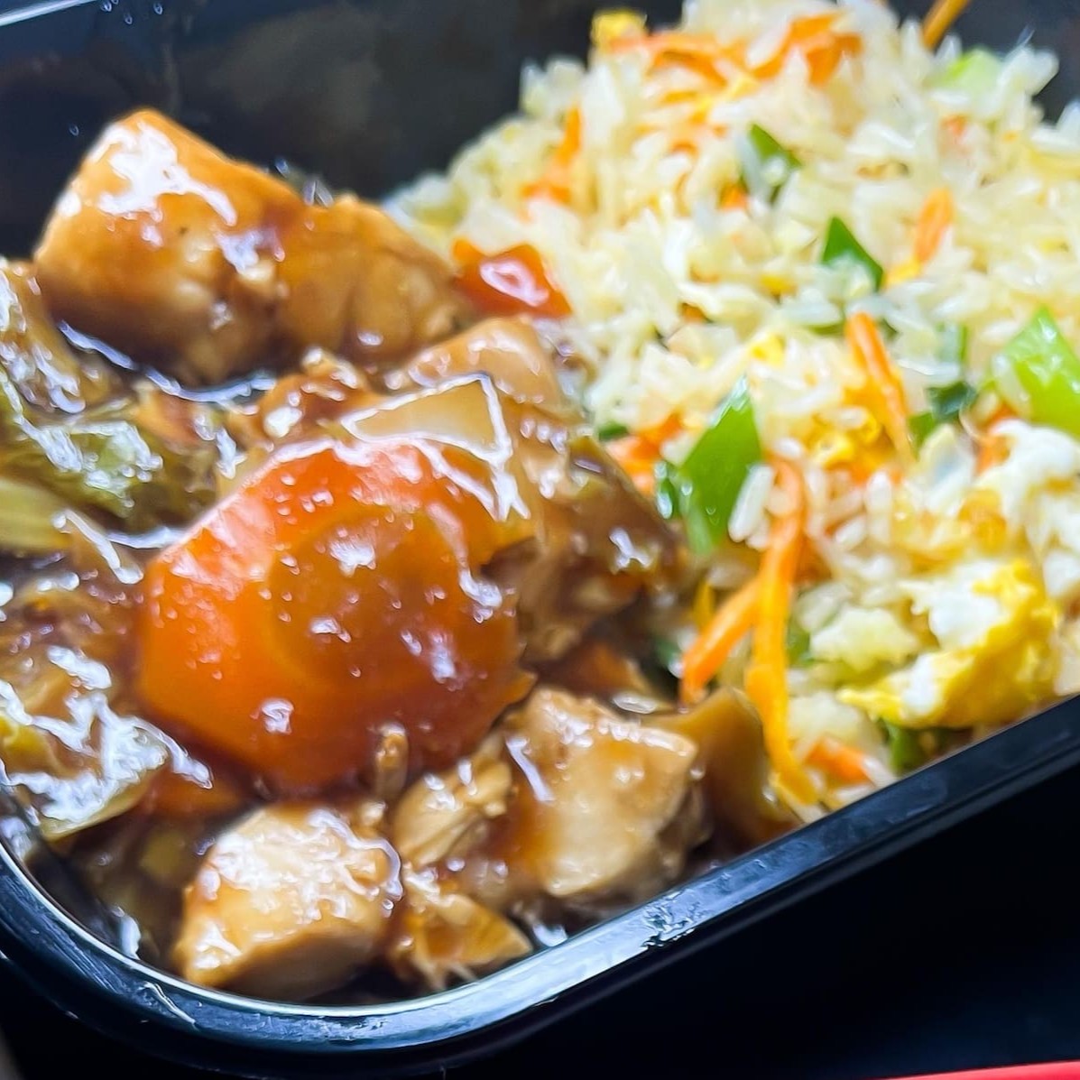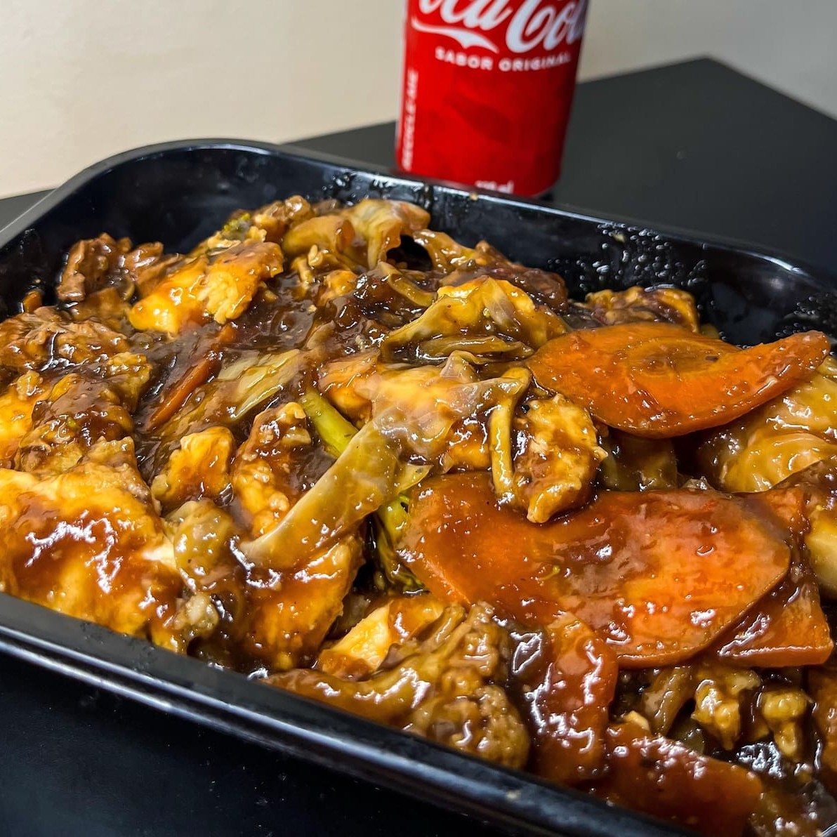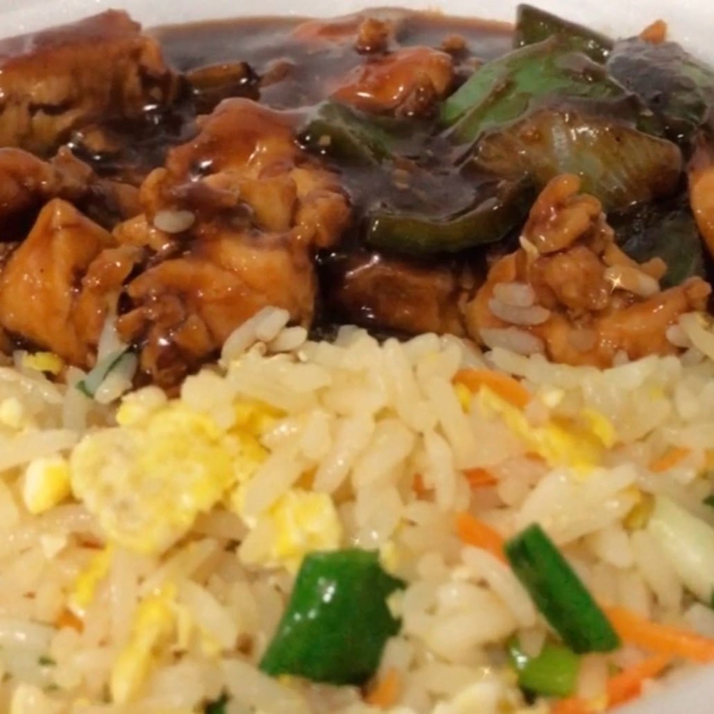 Delicioso frango xadrez com pimentão cebola ao molho do mestre e yakimeshi