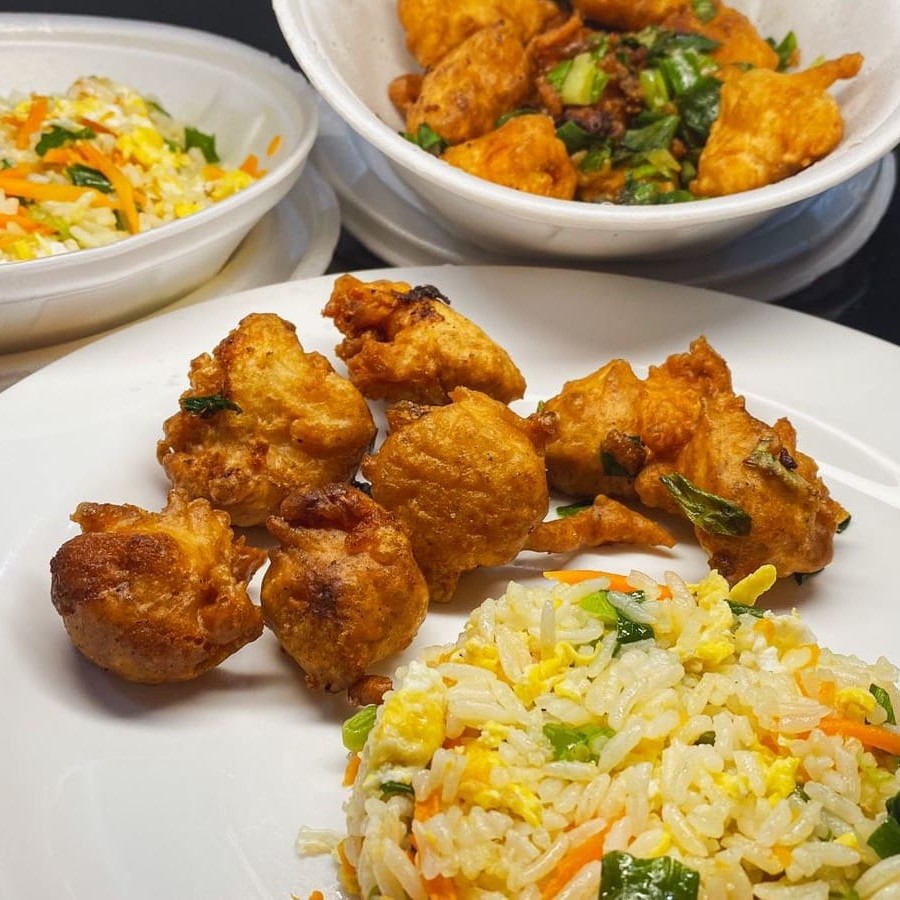 Delicioso Yakimeshi com frango empanado envolvidos na cebolinha
