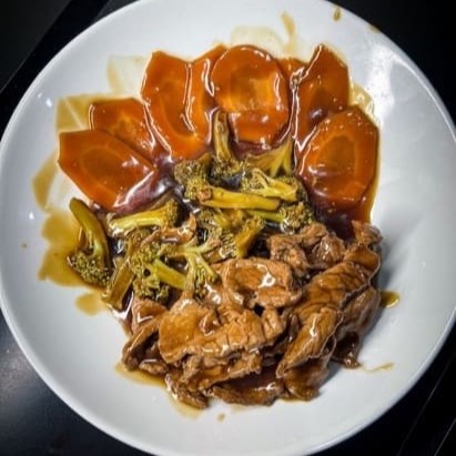 Filé em fatias de carne bovina com brócolis e cenoura ao molho do mestre