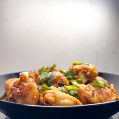 Deliciosos camarões empanados em massa leve salpicados na cebolinha
