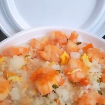 Delicioso arroz com ovo em flocos cebolinha ,cenoura e camarão
