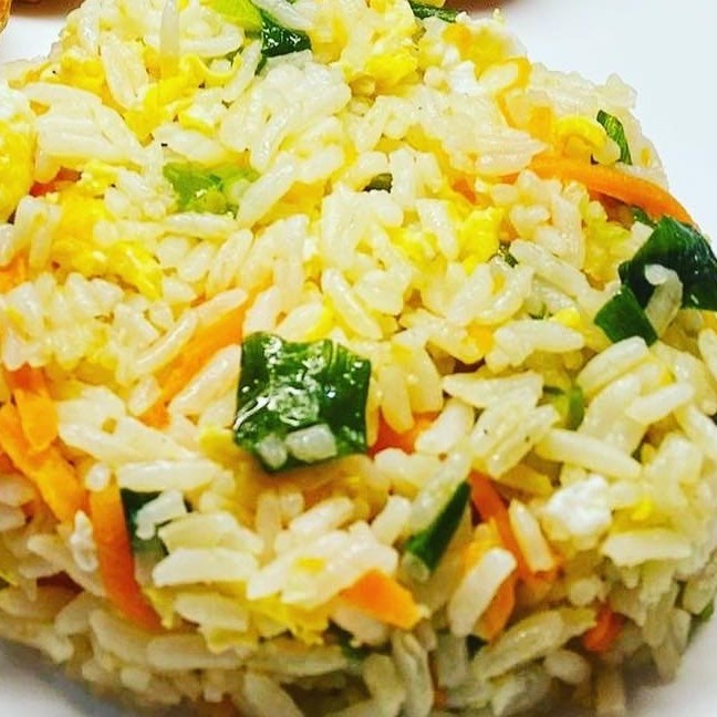 Delicioso yakimeshi com cenoura ,ovo em flocos ,cebolinha com franguinho em cubos fritos levemente com shoyu