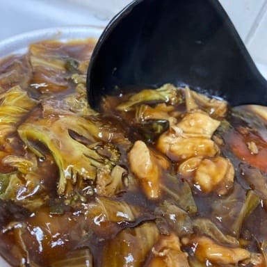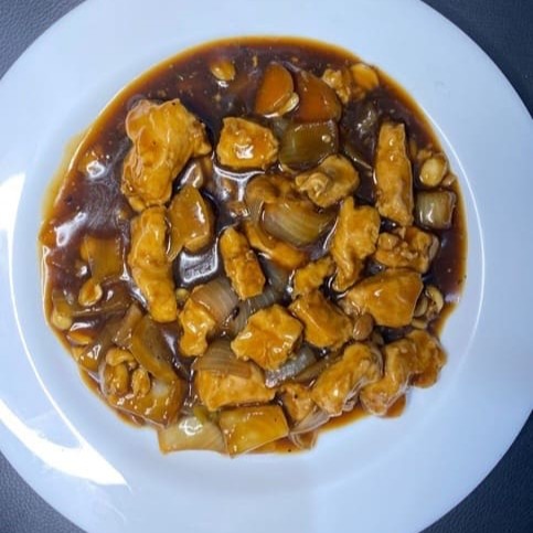 Frango em cubos com pimentão, cebola amendoim ao molho do mestre .