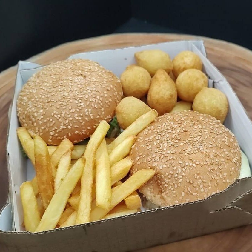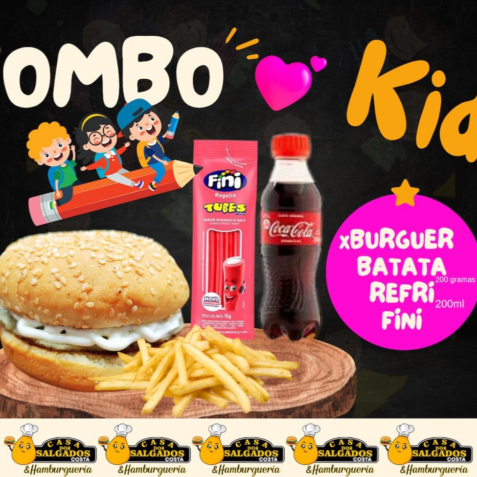 Acompanha 1 Burguer 1 Batata 200 g só sal 1 coca cola 200 ml e uma bala fini