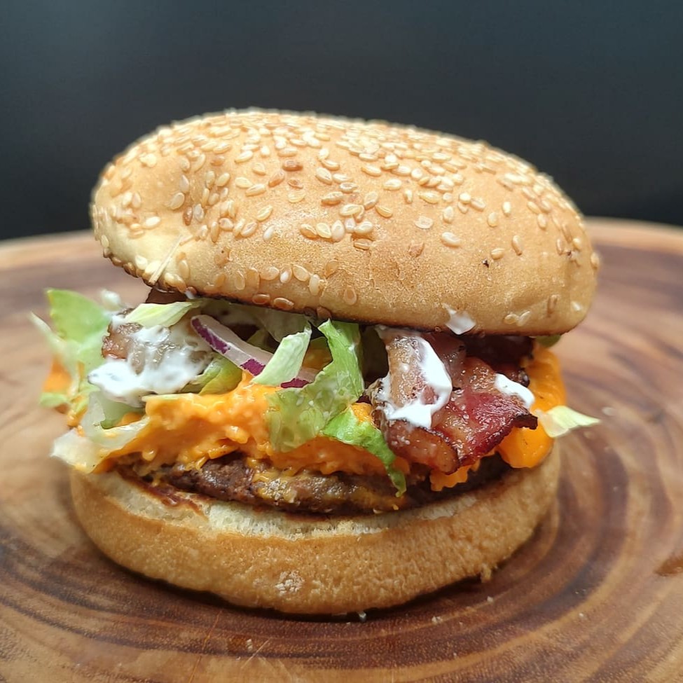 Pão de gergelim, hambúrguer industrializado, maionese da casa, cheddar, bacon, alface, tomate e cebola.