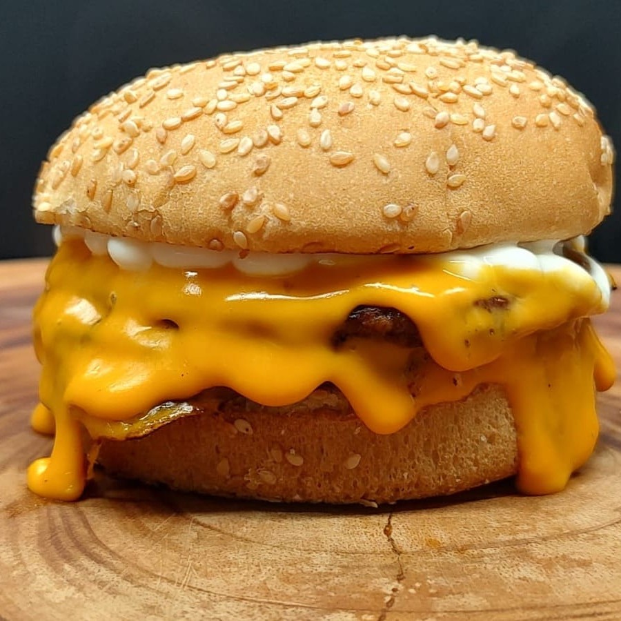 Pão de gergelim, hambúrguer industrializado 90gramas, maionese da casa e muito cheddar.