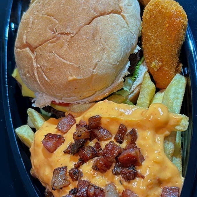 Um x-burguer artesanal, batata frita com cheddar com bacon, nuggets e um refrigerante de 350ml de brinde!