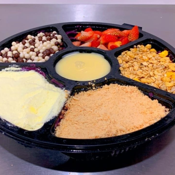 Nosso cremoso Açaí natural e sem glúten, é servido em uma roleta de e segue com 06 acompanhamentos a sua escolha.