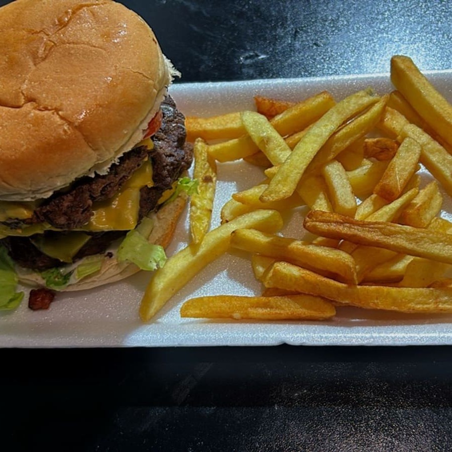 Delicioso combo x-tudo (pão, 3 hambúrgueres artesanais, salada bacon, queijo, e maionese, com batata frita e um refrigerante de 350 ml de brinde!