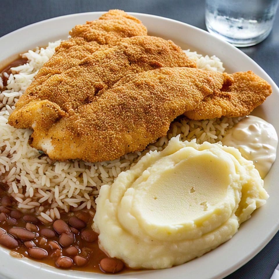 Filé de peixe empanado crocante por fora e suave por dentro, acompanhado de purê cremoso, arroz branco e feijão caipira.