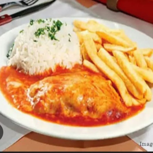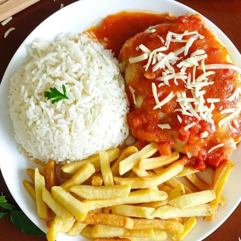 Filé de frango empanado e coberto com molho de tomate e queijo mussarela. Acompanha arroz e batata frita. Obs: Não Fazemos Nenhuma Alteração No Prato.