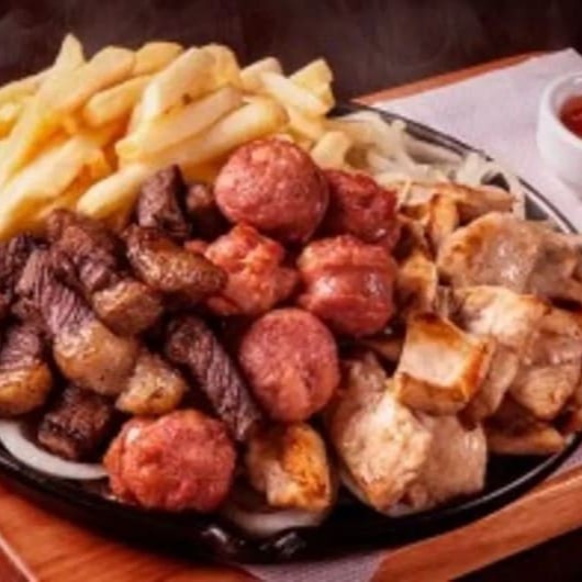 Mix de carnes grelhadas bovina, linguiça toscana e pernil, acompanhados com arroz branco soltinho, feijão caipira, farofa temperada e batata frita