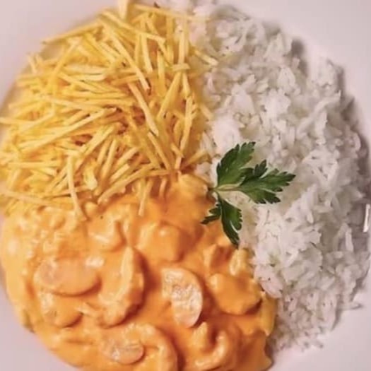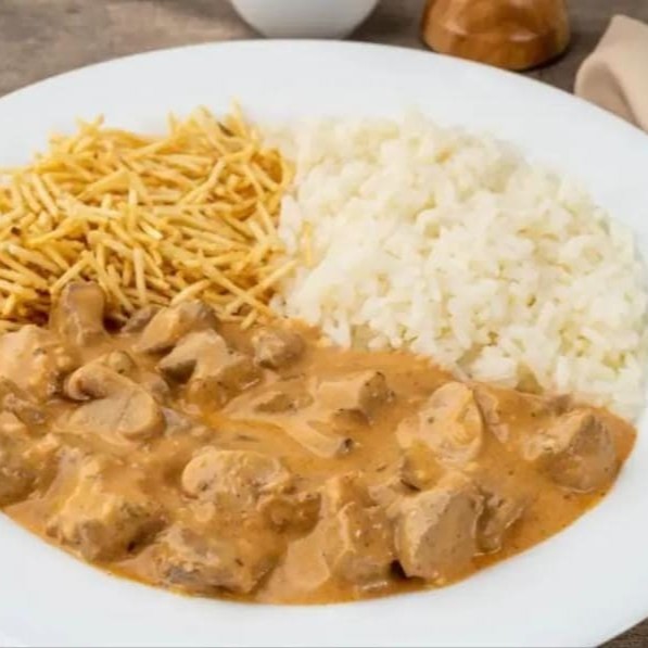 Suculentos cubos de carne com molho artesanal a base de creme de leite, ketchup, mostarda e manteiga. Acompanha batata palha crocante, arroz branco soltinho.