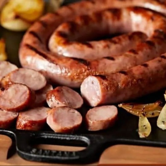 Linguiça toscana grelhada acompanhada de arroz branco soltinho, feijão caipira, farofa temperada e batata frita