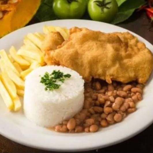 Arroz branco soltinho acompanhado por feijão carioca, batata frita, farofa da casa e Filé de frango empanado. Obs: Não Fazemos Nenhuma Alteração No Prato.