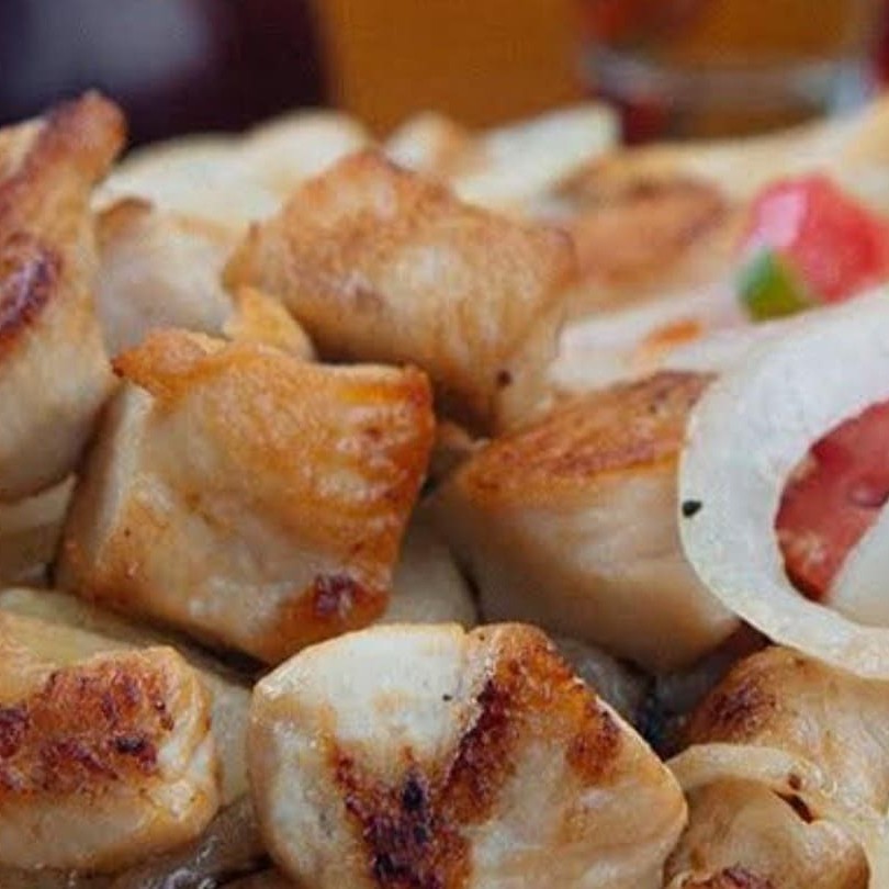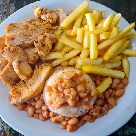 Cubos de frango grelhados bem suculentos acompanhados de arroz branco soltinho, feijão caipira, farofa temperada e batata frita Obs: Não fazemos nenhuma alteração no prato.