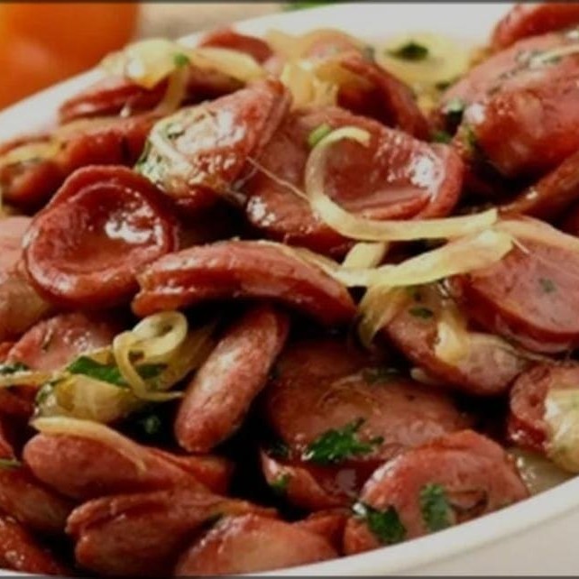 Fatias de calabresa acebolada grelhadas acompanhadas de arroz branco soltinho, feijão caipira caseiro, farofa temperada e batata frita. Obs: Não fazemos nenhuma alteração no prato.