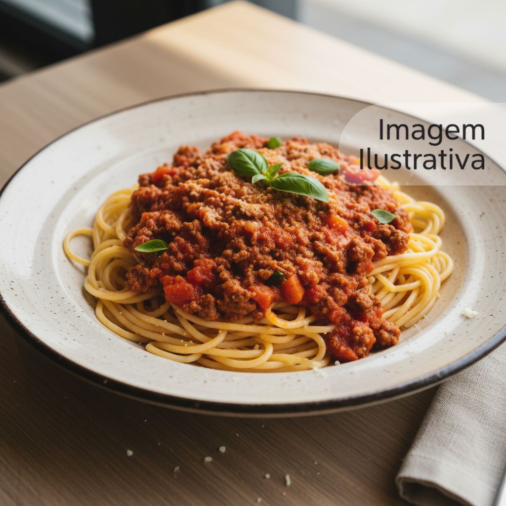 Espaguete servido com um delicioso molho à bolonhesa, feito com carne moída e cheiro verde.