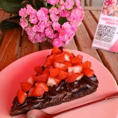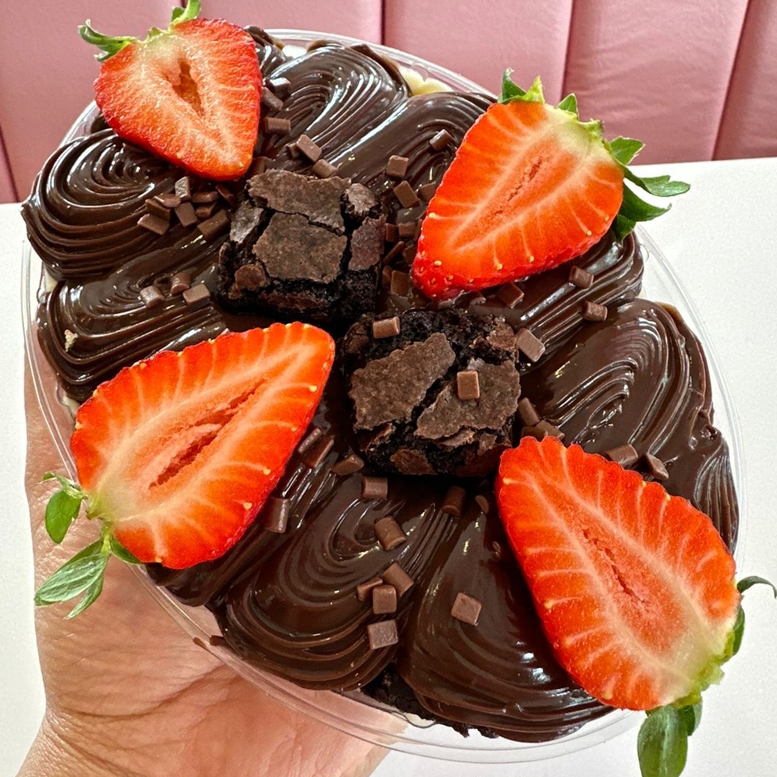 Brownie chocolatudo coberto com muito brigadeiro cremoso quentinho e morangos para decorar, uma delícia (peso 250 gramas)