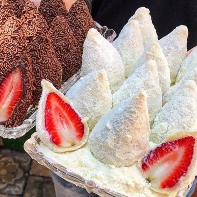 Creme de Ninho, brigadeiro cremoso e morangos frescos.