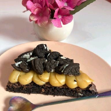 Fatia de brownie, brigadeiro de Ninho e Oreo.