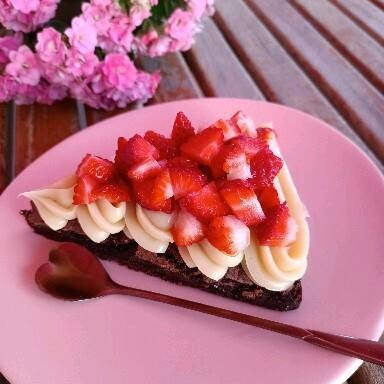 Fatia de Brownie, brigadeiro de Ninho e morangos.