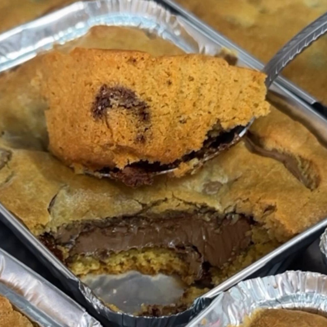 Massa de cookie na marmitinha, recheado com Nutella puríssima, uma perfeição a cada colherada. Peso aproximado 200g