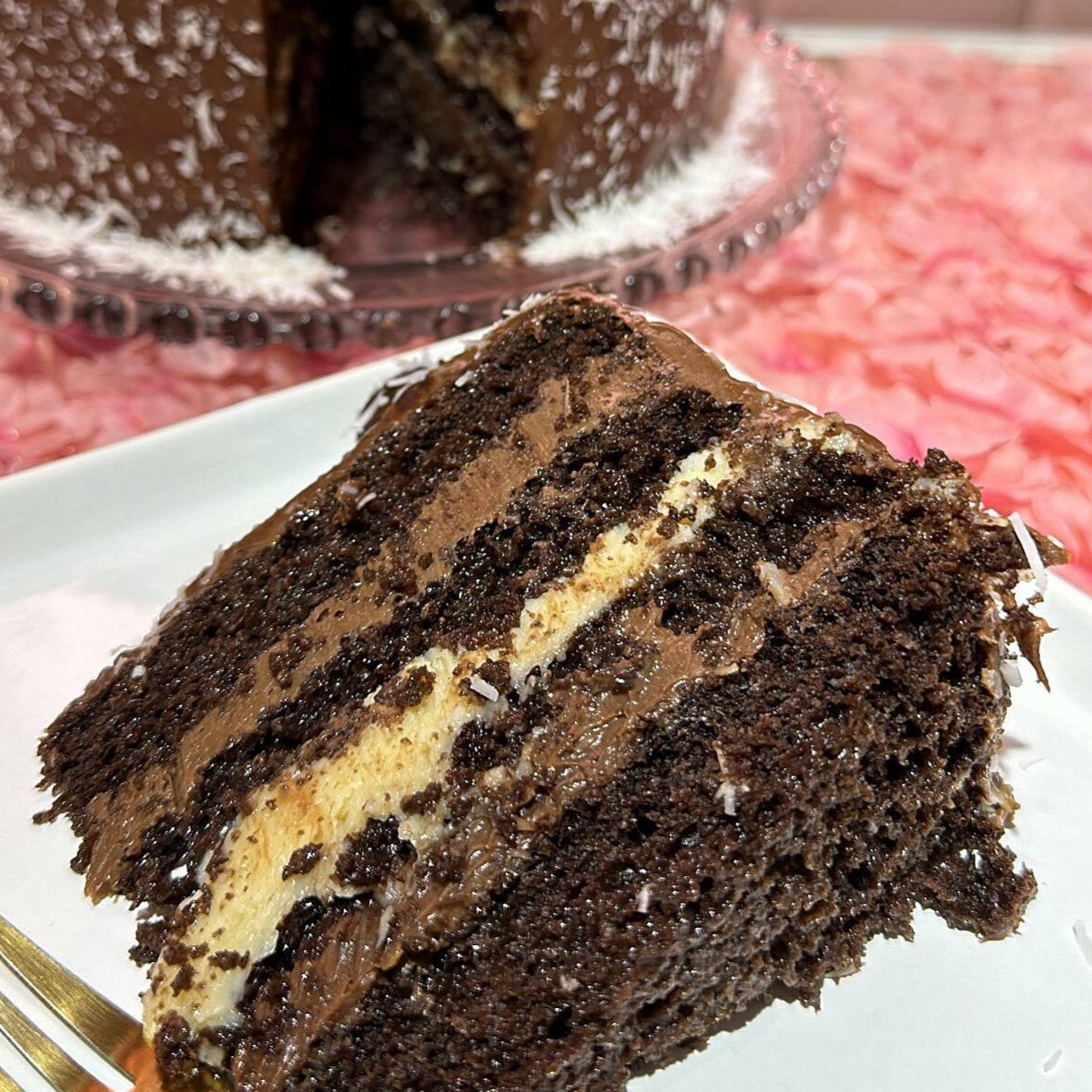 Massa de chocolate molhadinho com recheio de ganache nobre ao leite e brigadeiro de coco, cobertura de chocolate e coco , bolo irresistível!!