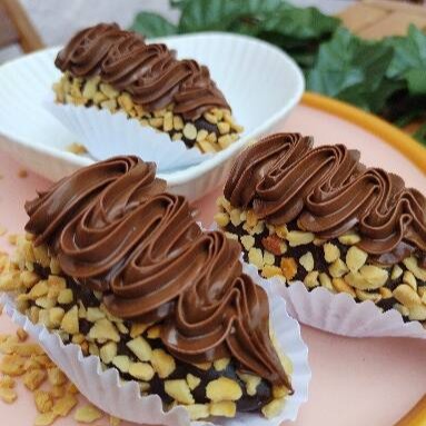 Coxinha de morango com brigadeiro, envolta com amendoim triturado e finalizada com Nutella (inspirada no bombom Ferrero Rocher)