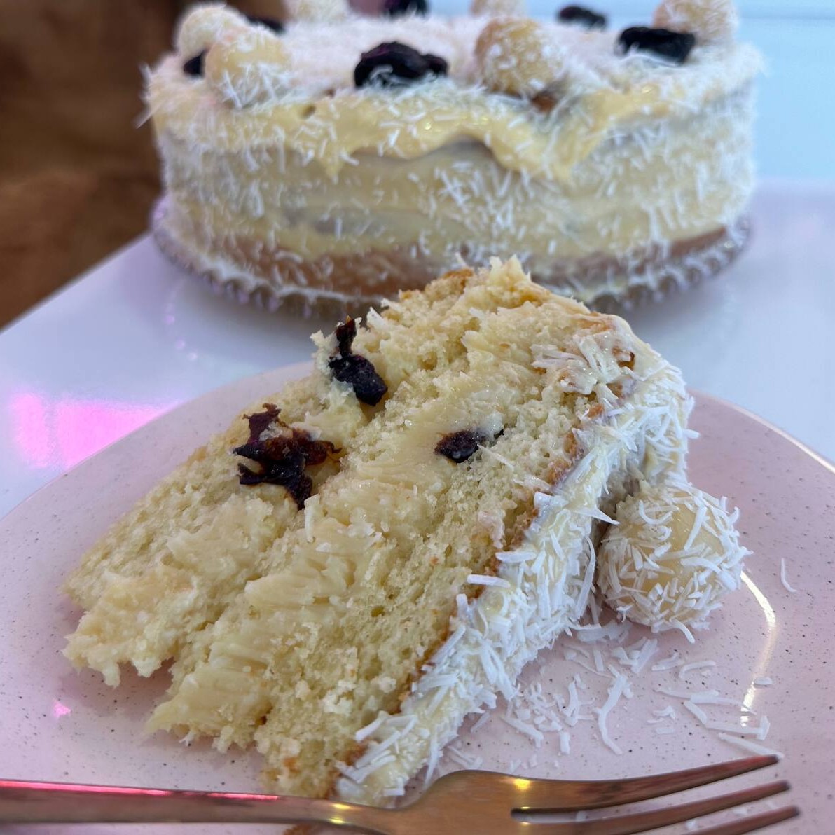 Massa fofinha de baunilha, recheada com brigadeiro branco cremoso, geleia de abacaxi caseira e coco ralado, produto artesanal feito com todo carinho especialmente para você!! (Peso aproximado 200g). *Atenção: o preço a cima é referente a uma fatia do produto. **Atenção: produto vendido por peso (gramas) e não por tamanho! ***Atenção: Utilizamos uma mesma embalagem para varios tipos de produtos, logo pode ser que o item seja menor que a embalagem.