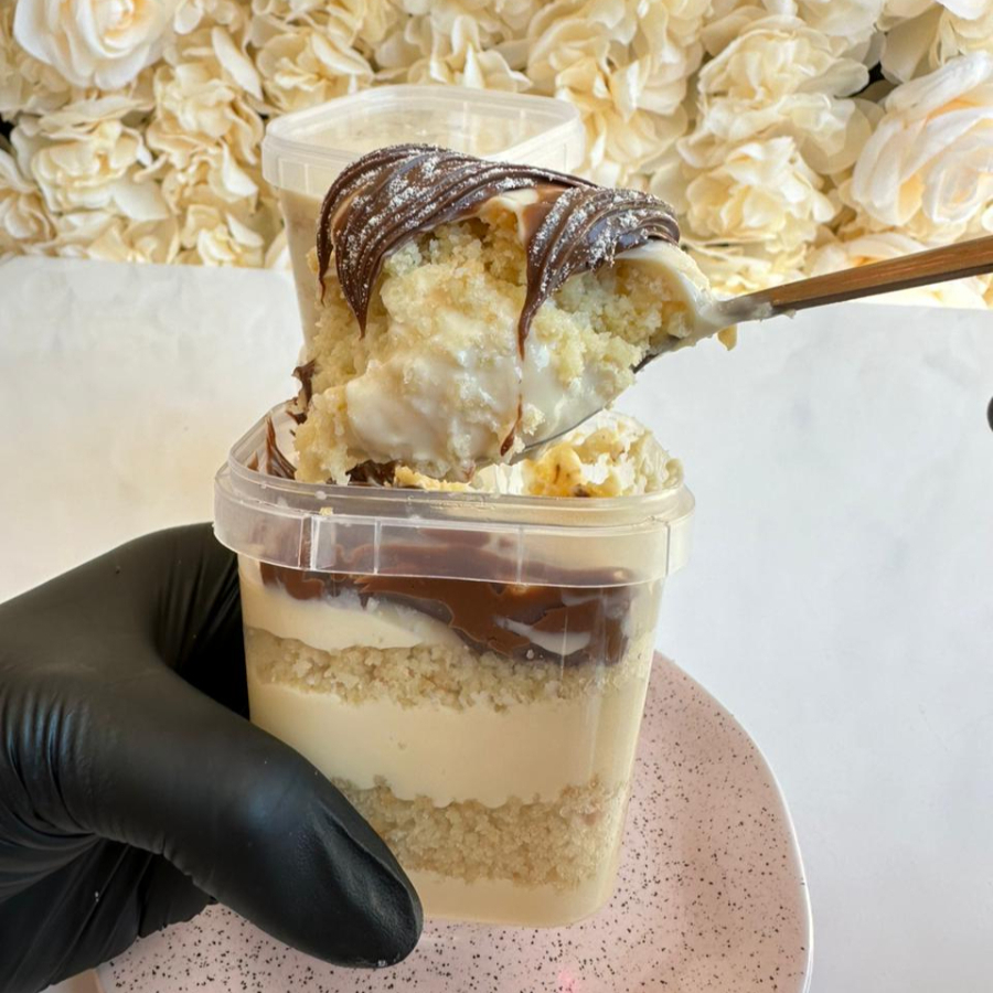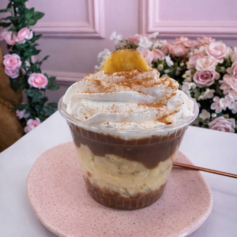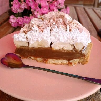 Creme de doce de leite, banana em rodelas, chantilly, bolo esfareladinho e canela.