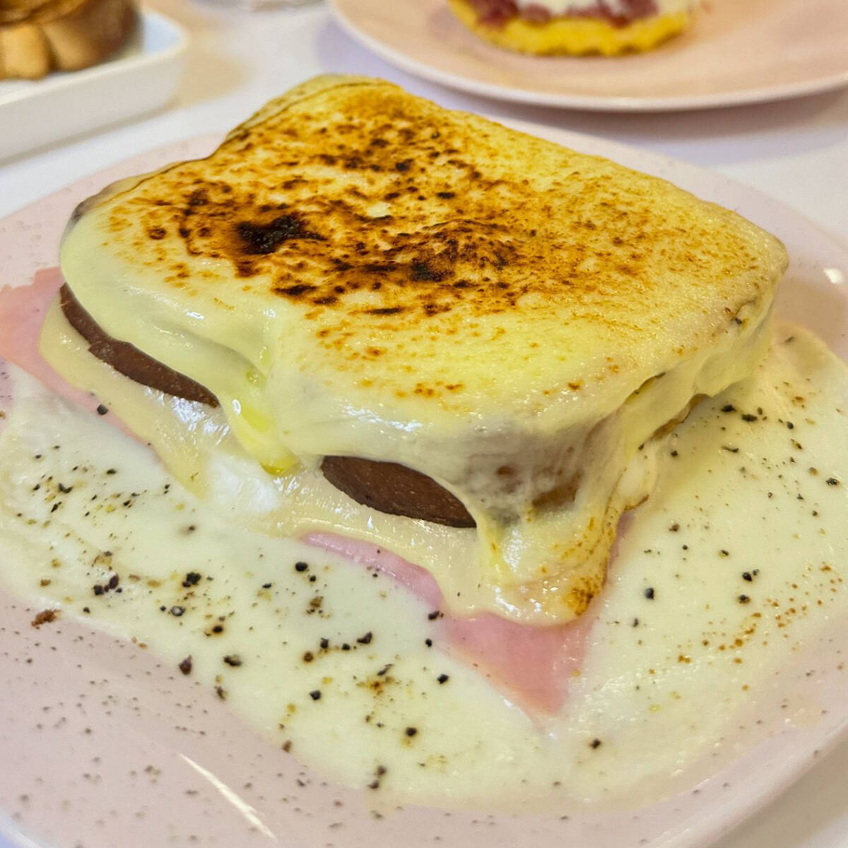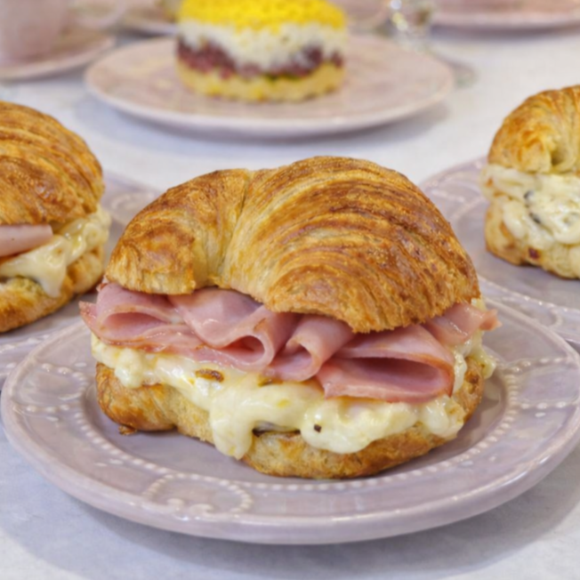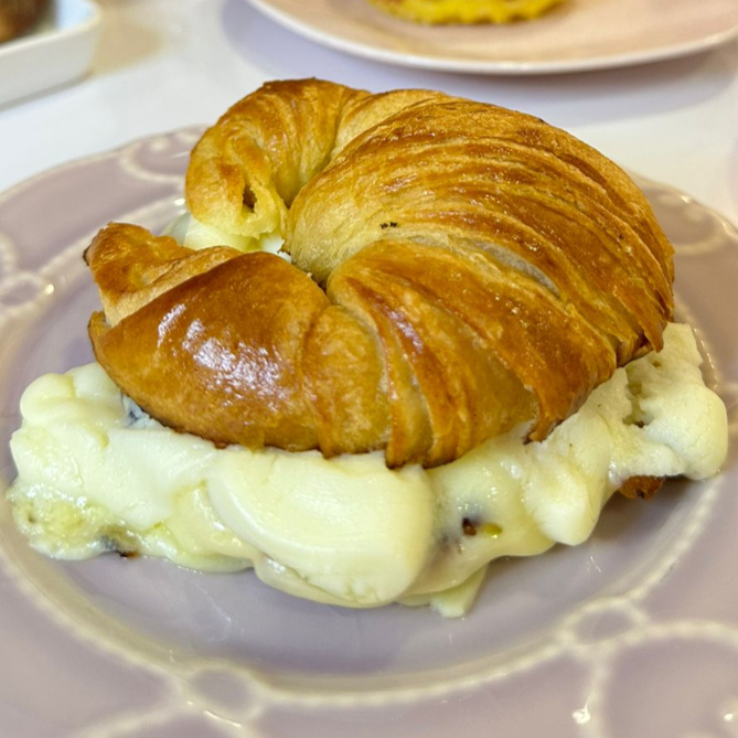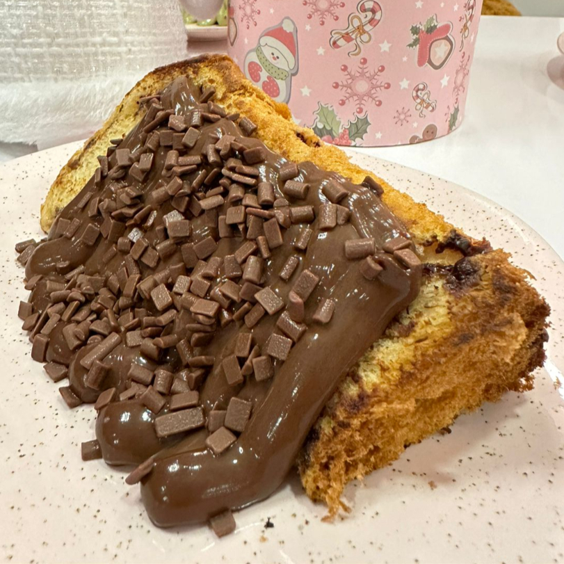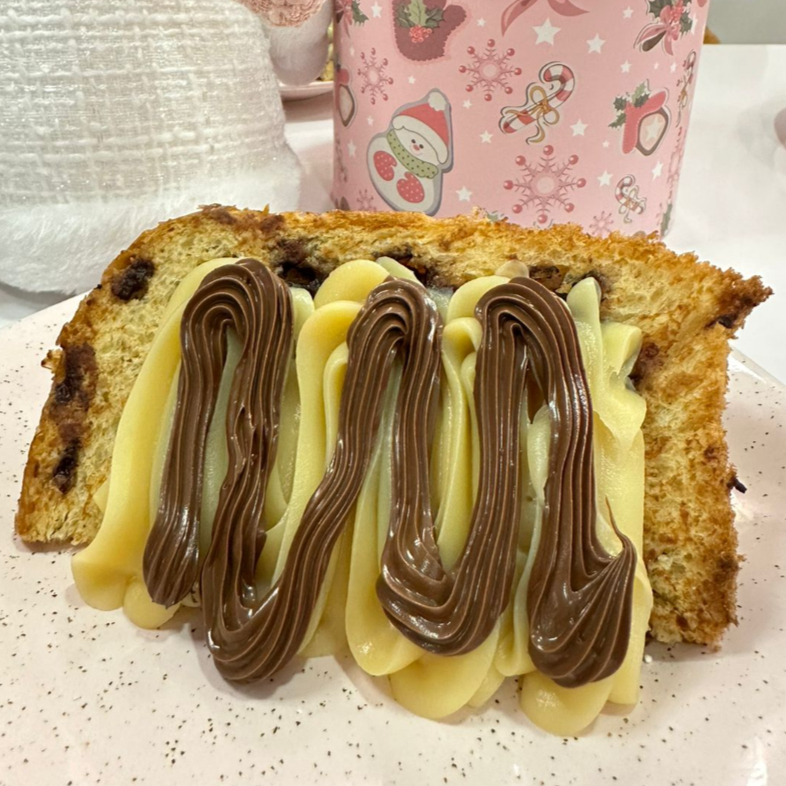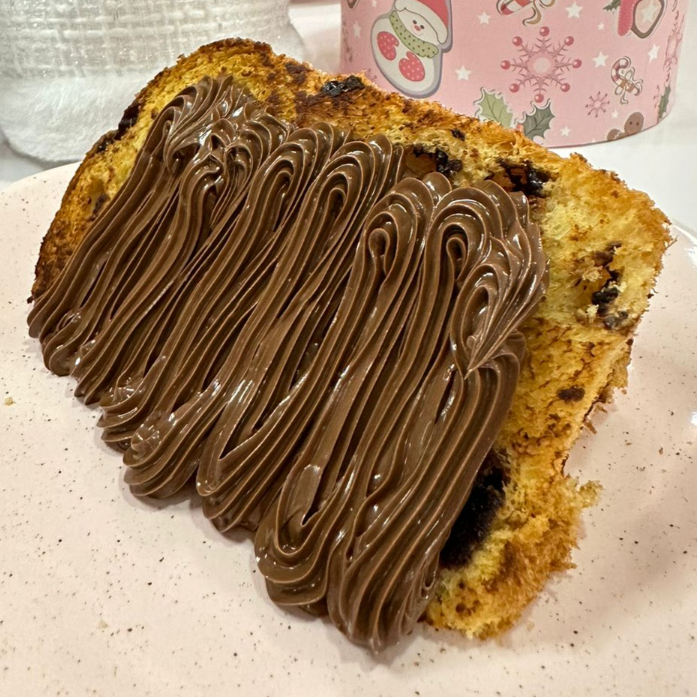 Fatia de chocotone tostado coberto com ninho e nutella.