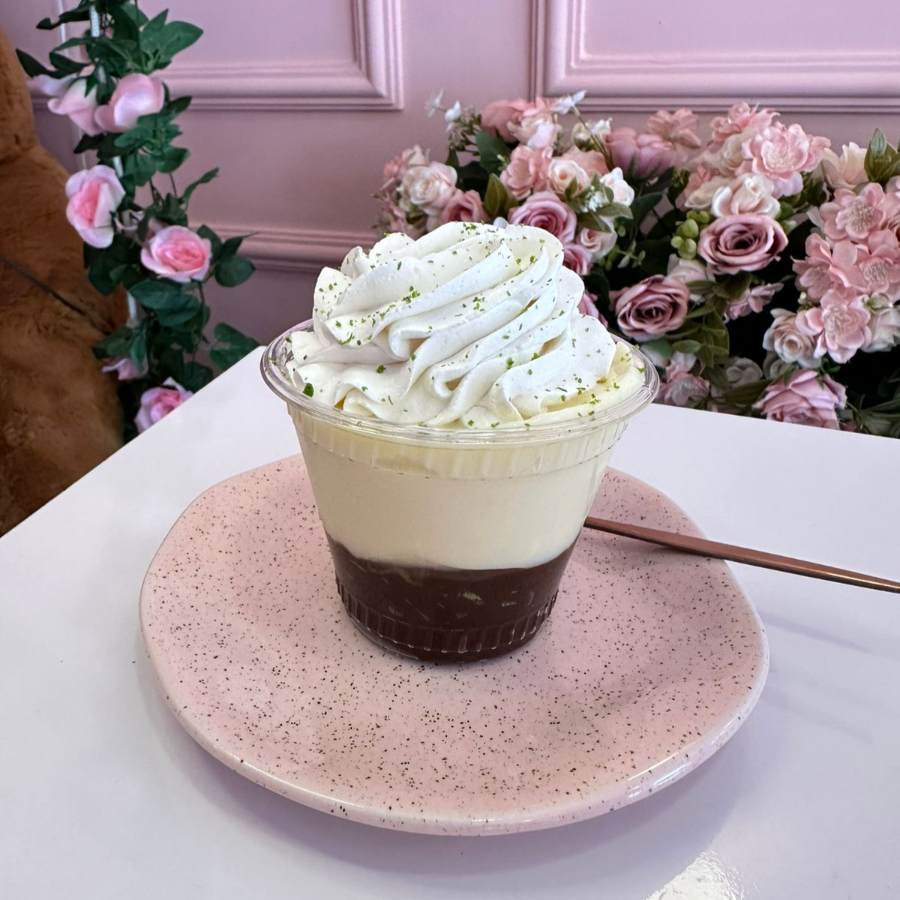Pedacinhos de chocotone no pote com brigadeiro branco cremoso e brigadeiro tradicional cremoso.