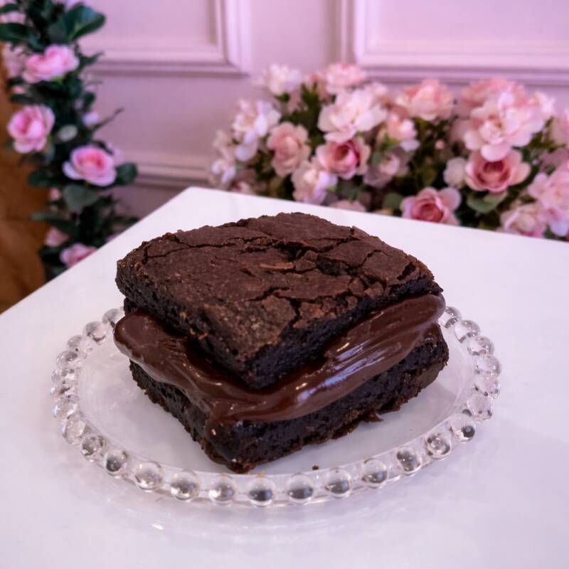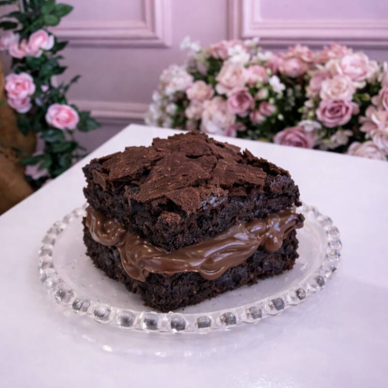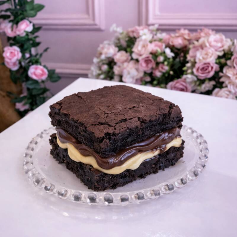 Fatia de brownie, brigadeiro de Ninho e Nutella.