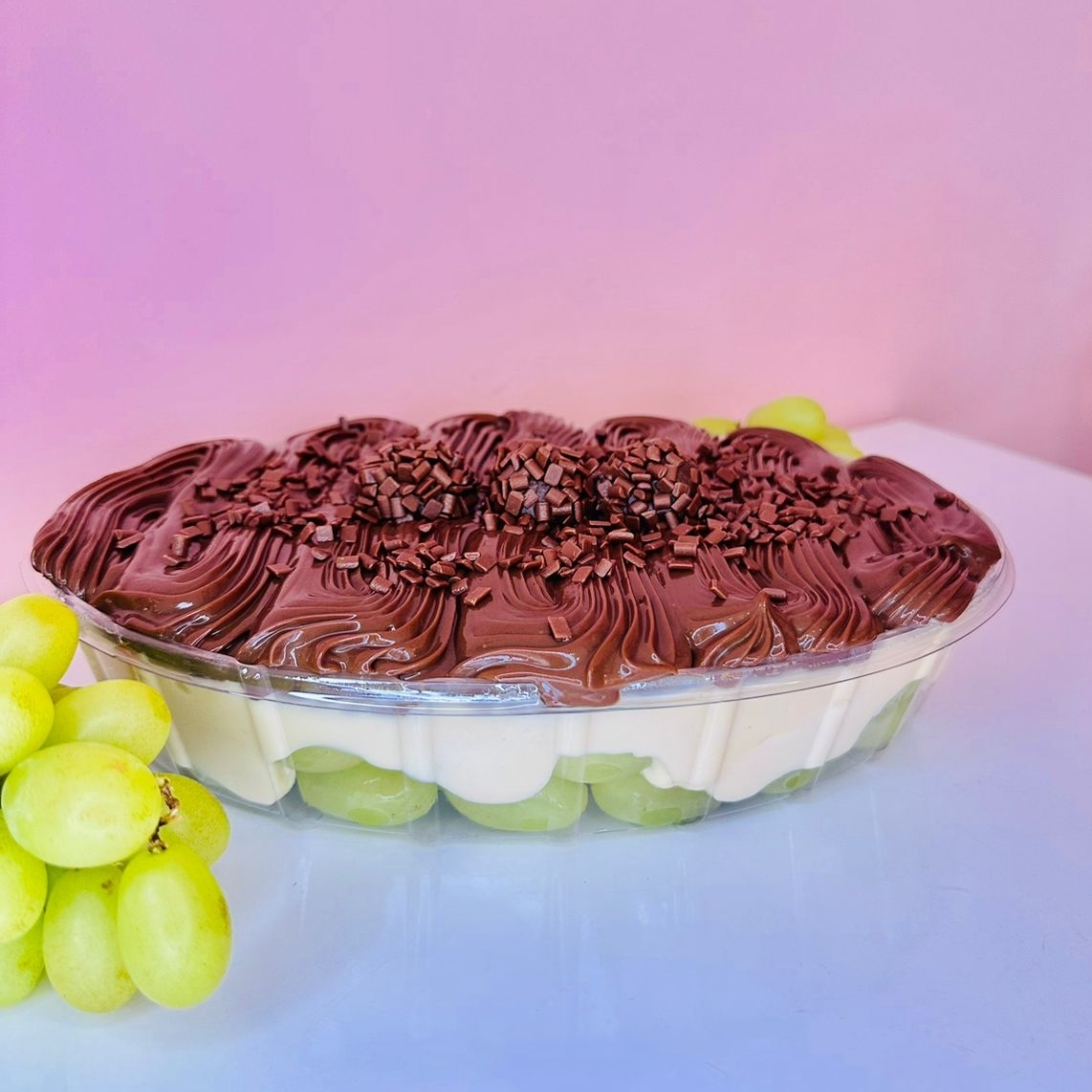 Sobremesa feita com uvas fresquinhas, brigadeiro cremoso de Ninho e brigadeiro cremoso 50% cacau. Atenção: atente-se ao tamanho do produto, pois o mesmo não é vendido no peso e sim por tamanho. (Temos dois tamanhos embalagem de 750ml e 1.5 Litros).